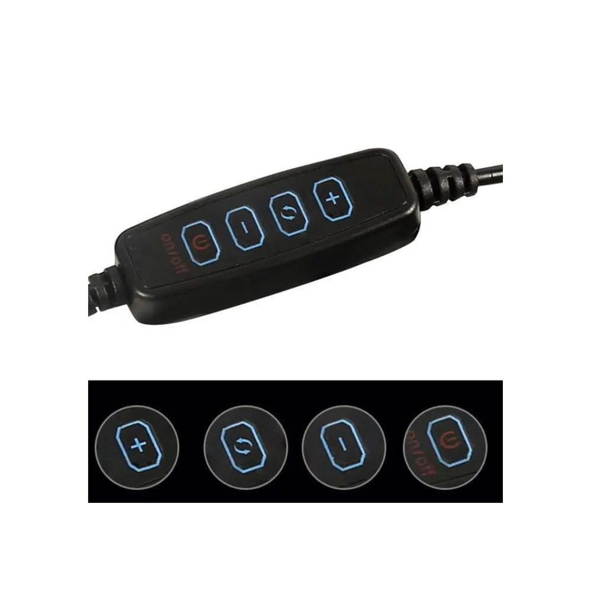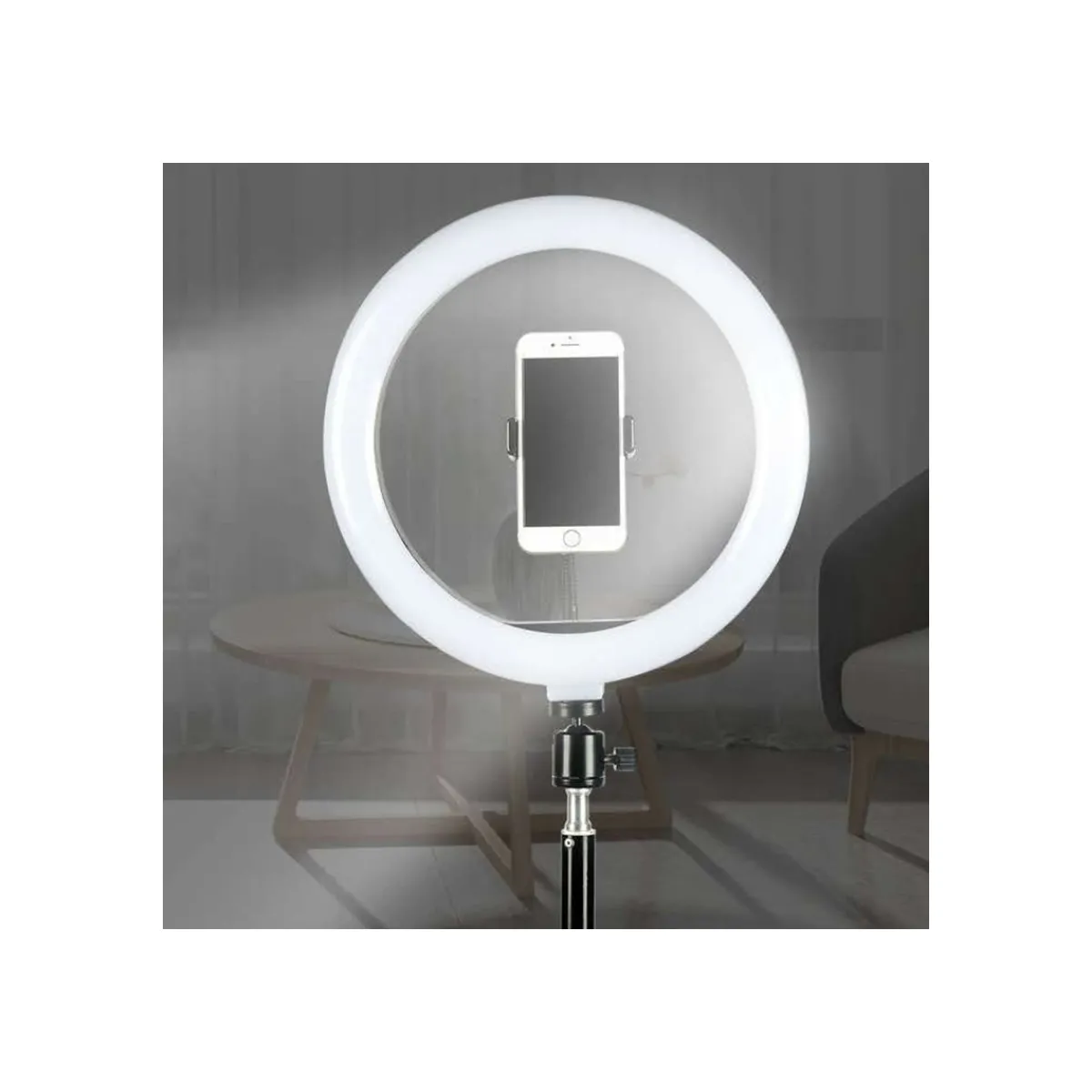 Anneau lumineux LED pour selfie de 26 cm avec clip pour téléphone et tête sphérique à 360 degrés pour trépied. (Il est adapté au support pour téléphone de table et au support pour téléphone trépied). Le téléphone se place dans le clip. Vous pouvez régler l’intensité lumineuse avec les boutons + et – ainsi que la température de couleur lumière chaude ou lumière froide. 3200K-5600k.
