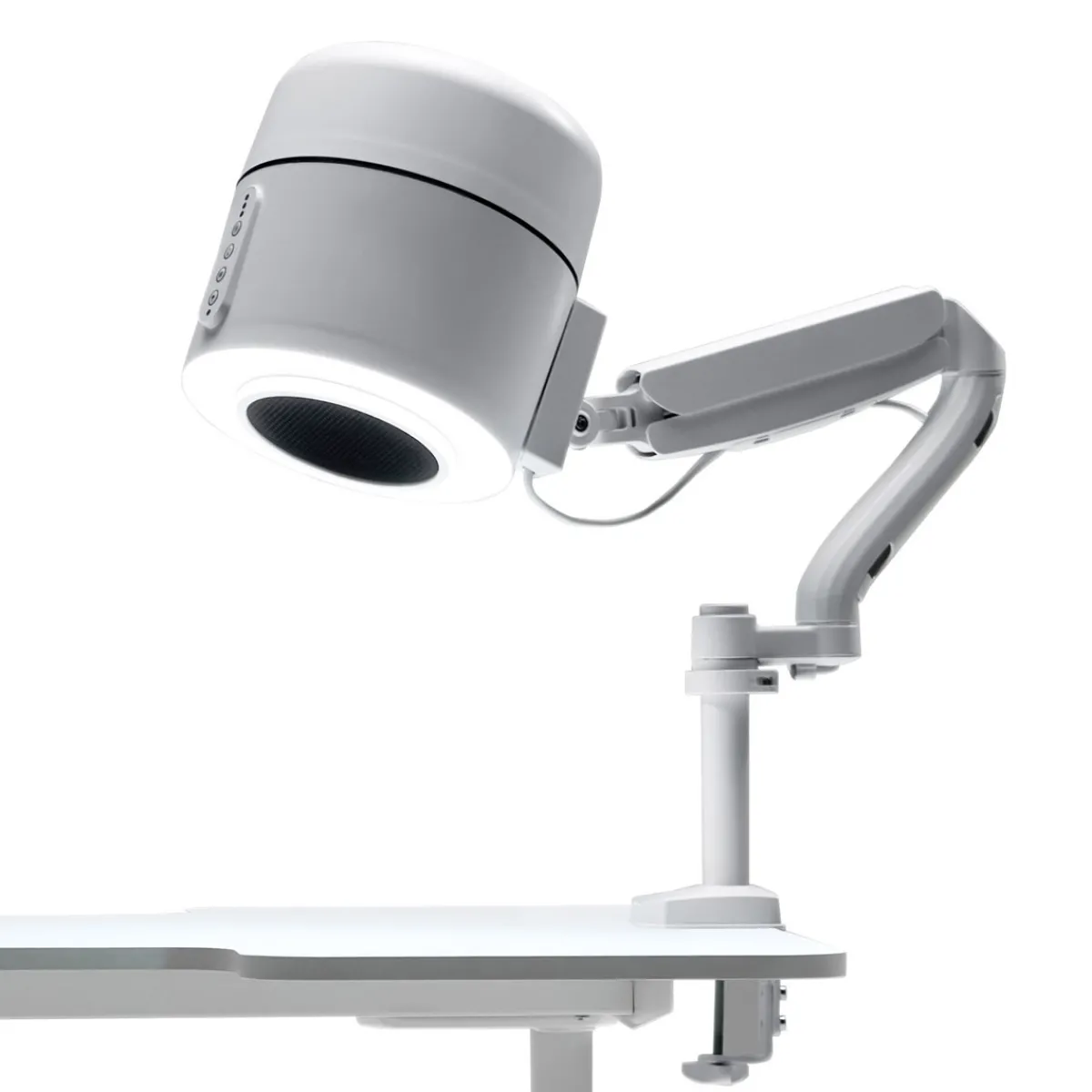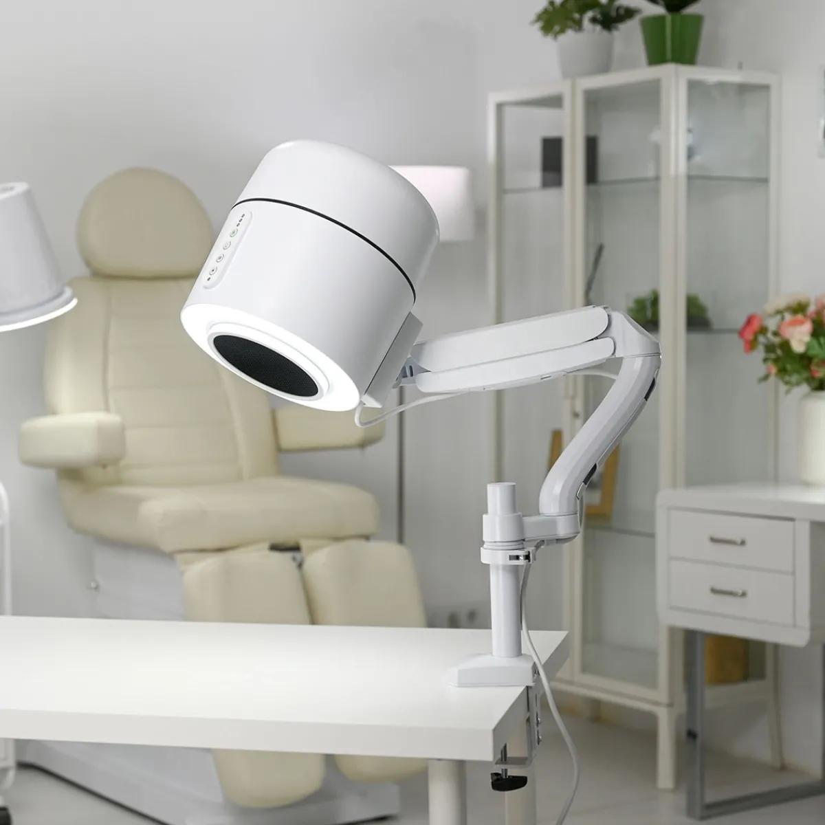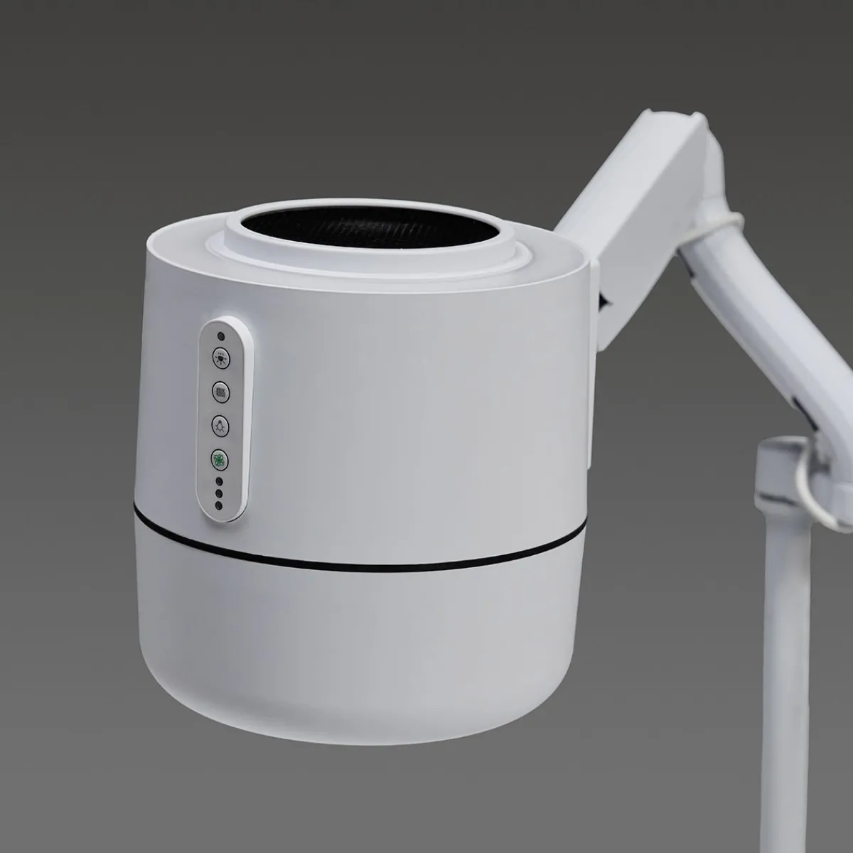 – Design ergonomique et intuitif : Corps cylindrique, commandes simples (4 boutons), bras articulé avec rotation à 360°, montage sur table ou pied mobile.