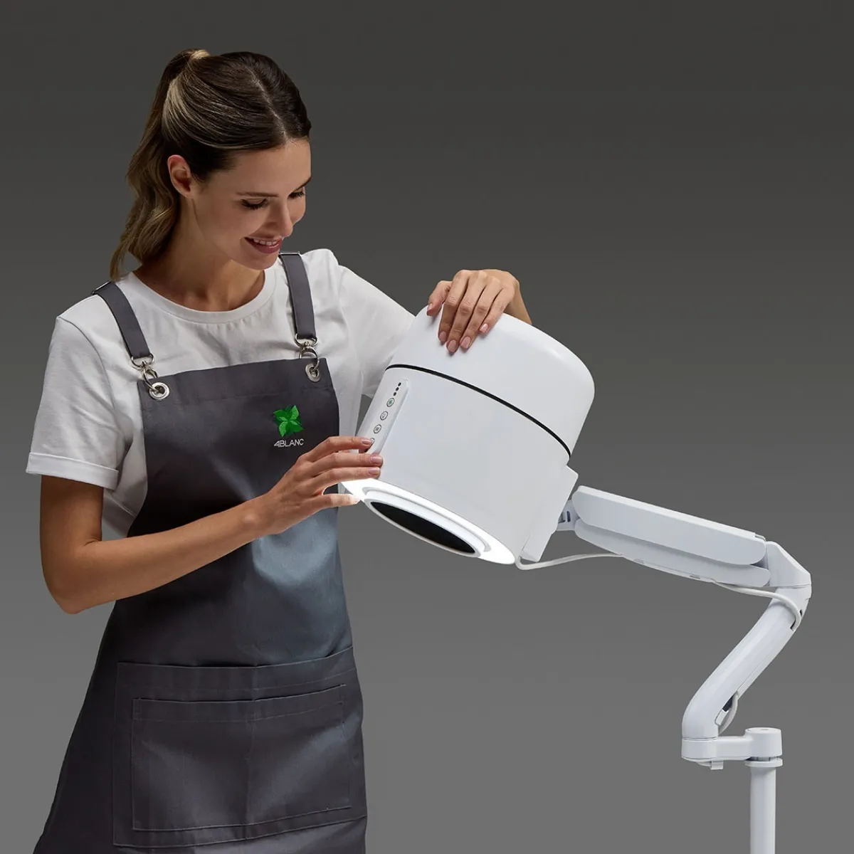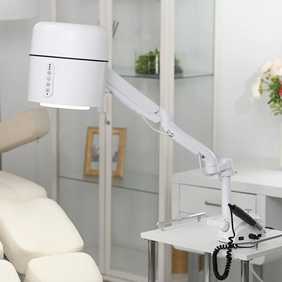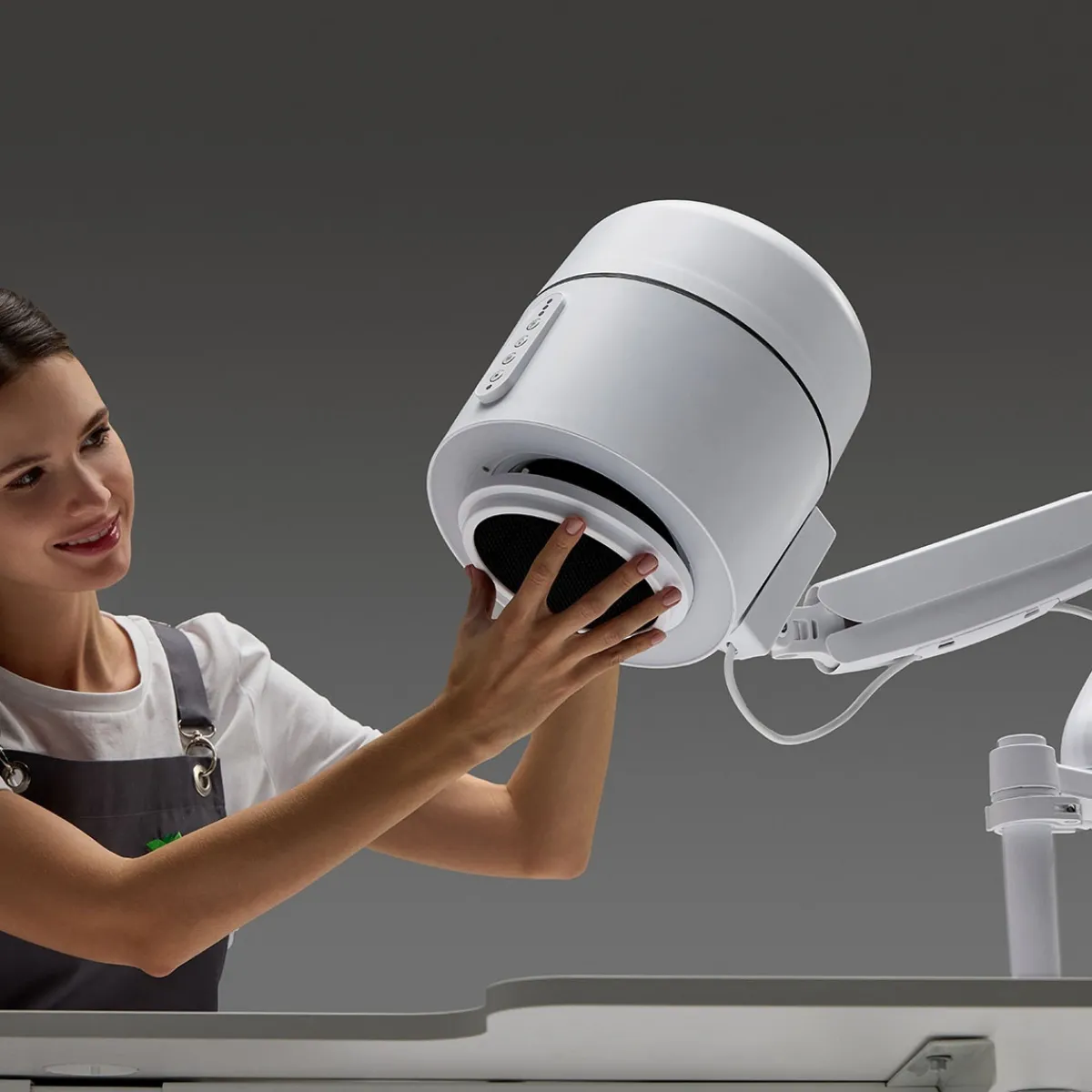 – Design ergonomique et intuitif : Corps cylindrique, commandes simples (4 boutons), bras articulé avec rotation à 360°, montage sur table ou pied mobile.
