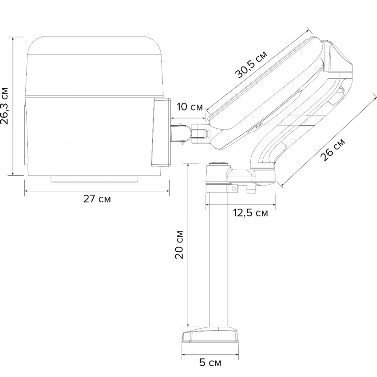 – Fixation : se fixe sur la table (10² cm requis). Peut également se fixer sur un pied à roulette mobile, vendu séparément.