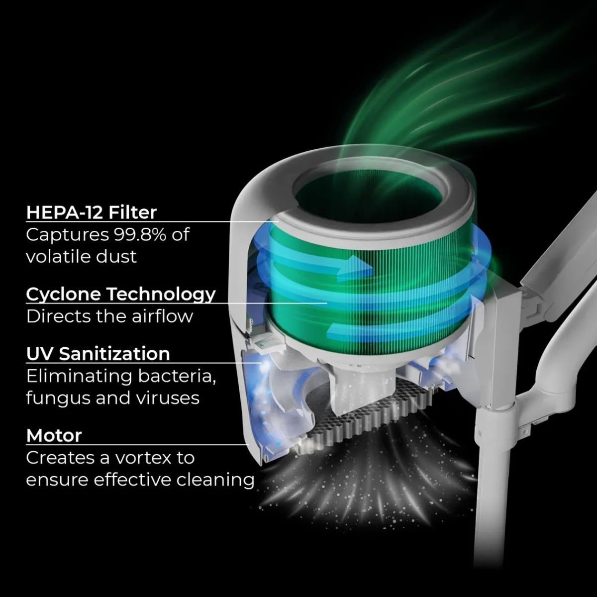 – Technologie cyclonique avancée : Aspire jusqu’à 936 m³/h d’air, soit 9 m³/minute. Nettoie efficacement l’air ambiant et réduit les odeurs désagréables.