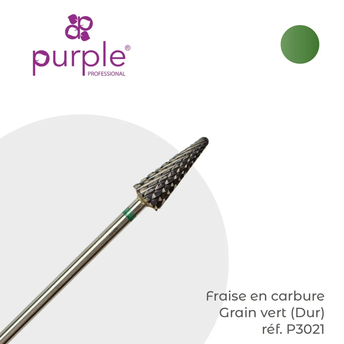 Fraise en carbone grain vert (Dur) de forme conique. Marque Purple. Idéale pour la dépose du gel, de la résine …