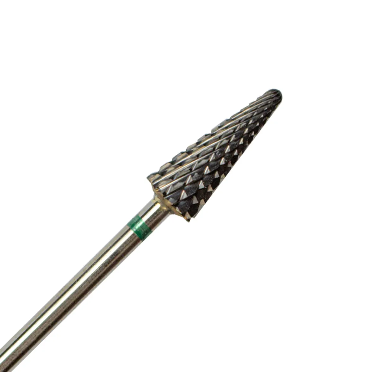 Fraise en carbone grain vert (Dur) de forme conique. Marque Purple. Idéale pour la dépose du gel, de la résine et de l’acrygel, ainsi que pour affiner la forme de la construction. Diamètre : 6 mm et longueur tête : 15 mm.