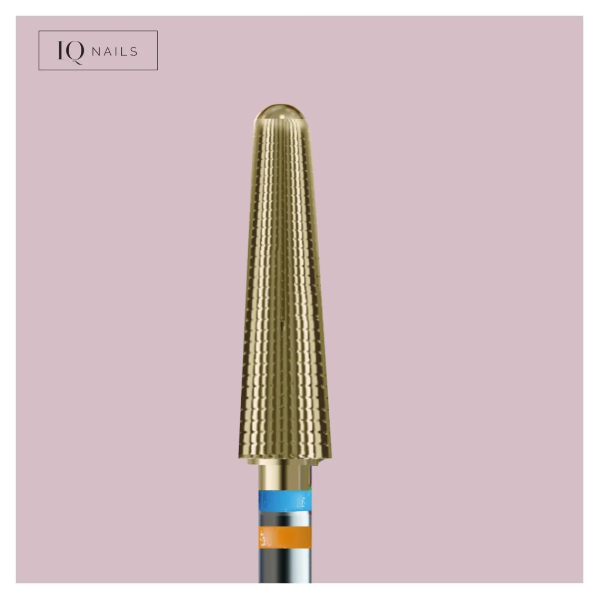 Fraise « Magic Refresh » en carbure forme conique de la marque IQ Nails. Embout arrondi sécurisé à grain bleu (moyen). La bague orange indique que cette fraise est adaptée pour les gauchers.