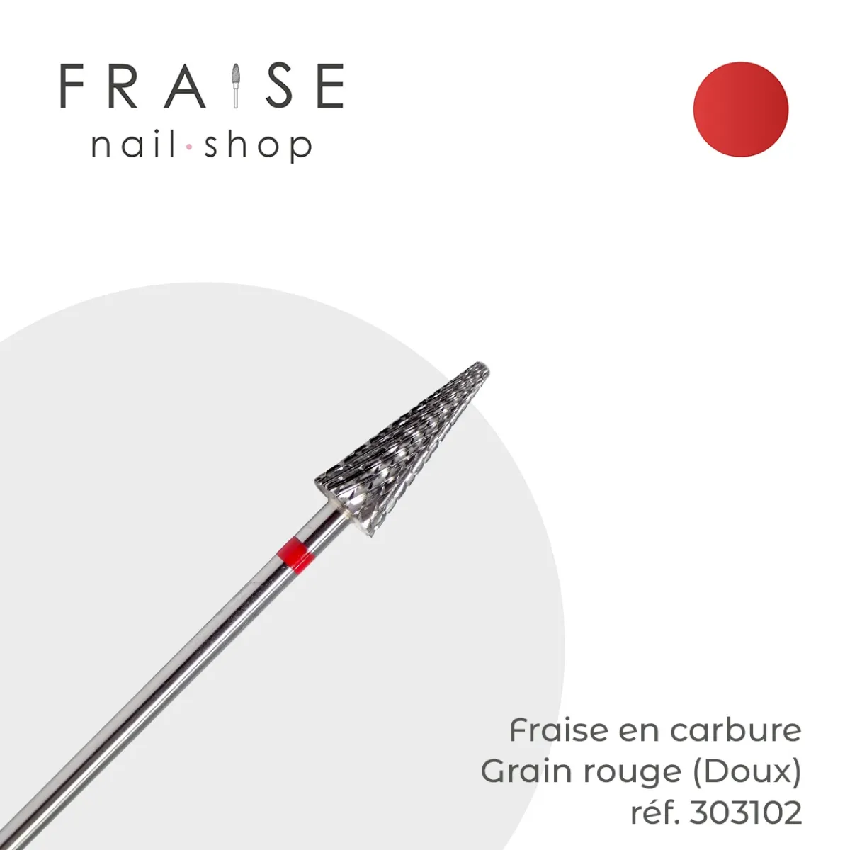 Fraise en carbure grain rouge (doux) forme conique. Embout pointu. Ne chauffe pas pendant la dépose et le ponçage. Cet embout permet de retirer le vernis semi-permanent et le gel (fine couche) en douceur, et d’affiner la forme de la construction. Diamètre : 0,6 cm.