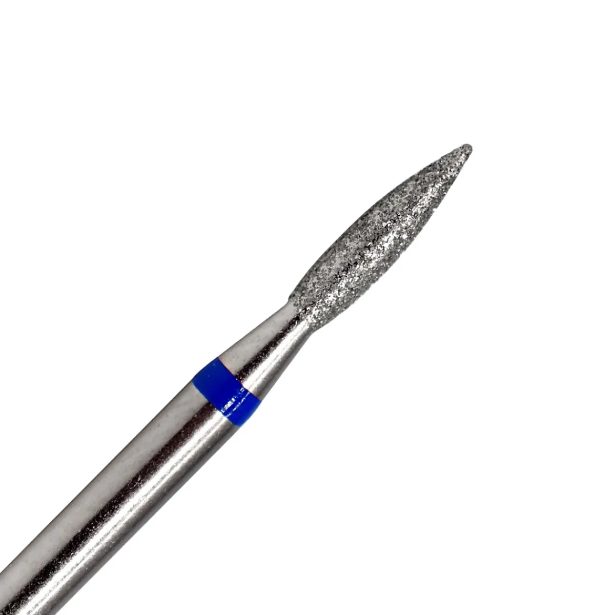 Fraise en diamant forme flamme. Embout pointu. Grain bleu (moyen) parfait pour l’ongle avec beaucoup de cuticules. Diamètre : 0,21 cm. S’utilise pour la préparation de la plaque de l’ongle, pour éliminer et nettoyer les cuticules et pour le repli latéral. Cette fraise permet d’optimiser l’adhésion du gel à l’ongle naturel et d’éviter les décollements.