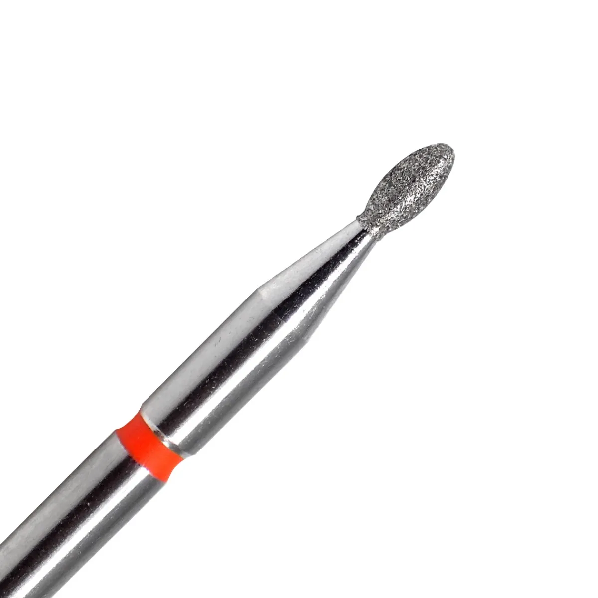 Fraise en diamant forme olive arrondie. Grain rouge (doux). Diamètre : 0,16 cm. S’utilise pour la préparation de la plaque de l’ongle et pour éliminer et nettoyer les cuticules ainsi que le repli latéral. Cette fraise permet d’optimiser l’adhésion du gel à l’ongle naturel et d’éviter les décollements.