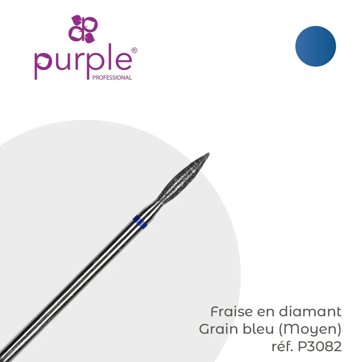 Fraise manucure Russe en diamant forme flamme grain bleu (moyen). Marque Purple. Diamètre : 2,3 mm et longueur de la tête : 10 mm. S’utilise pour la préparation de la plaque de l’ongle, pour éliminer et nettoyer les cuticules et pour le repli latéral. Cette fraise permet d’optimiser l’adhésion du gel à l’ongle naturel et d’éviter les décollements. Convient pour les mains et les pieds.