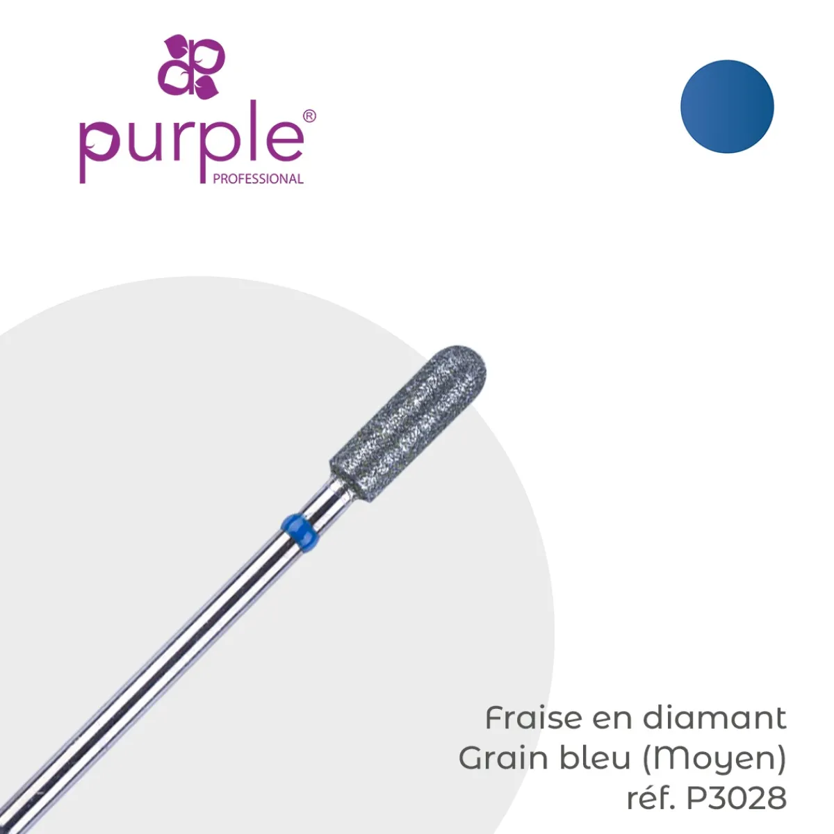Fraise manucure Russe en diamant forme tonneau grain bleu (moyen). Marque Purple. Diamètre : 3,9 mm et longueur de la tête : 12 mm. Embout arrondi sécurisé. S’utilise pour la préparation de la plaque de l’ongle, pour éliminer et nettoyer les cuticules ainsi que pour gommer les callosités. Cette fraise permet d’optimiser l’adhésion du gel à l’ongle naturel et d’éviter les décollements. Convient pour les mains et les pieds. Elle permet de couper les cuticules sans pince à envies en technique de manucure Russe.