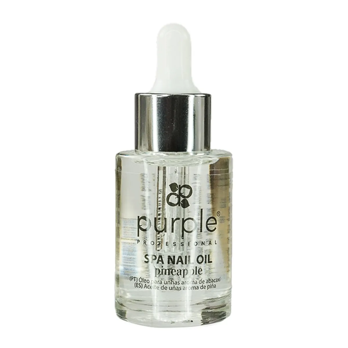 Huile pour les ongles et les cuticules parfumée à l’ananas, de la gamme Purple Spa. Flacon de 30 ml avec pipette.