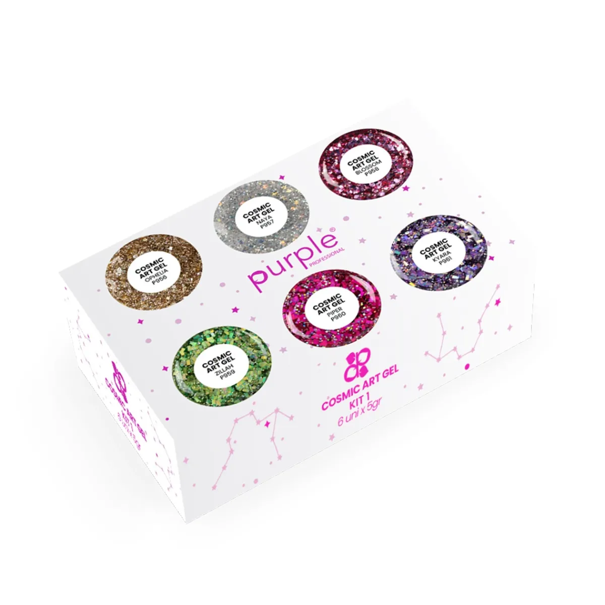 Le Kit Cosmic N°1 contient 6 pots de Cosmic art gel de 5 gr. Le gel Cosmic est un gel pailleté lumineux à utiliser pour vos Nail Art. Ce kit est constitué des 5 teintes suivantes :