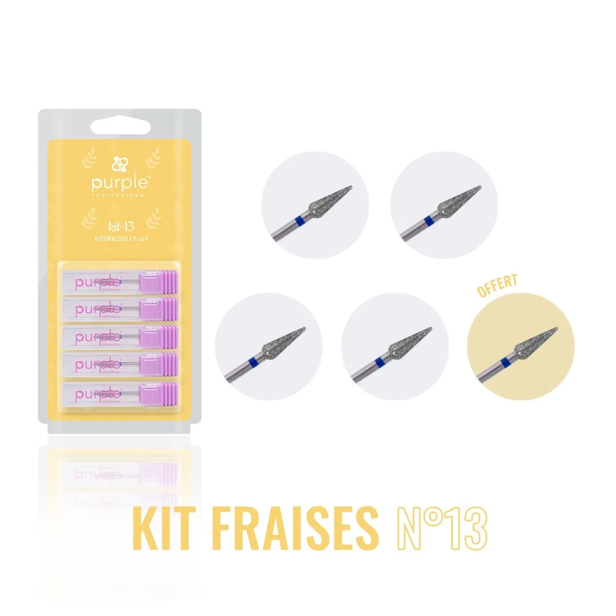 Le KIT DE FRAISES N°13 contient 5 embouts tulipe P3070 de la marque Purple Professional dont 1 embout offert. Cette fraise pour la manucure Russe en diamant s’utilise pour la préparation de la plaque de l’ongle et pour éliminer et nettoyer les cuticules.L’embout pointu permet de mieux nettoyer le repli latéral. Elle permet d’optimiser l’adhésion du gel à l’ongle naturel et d’éviter les décollements. Grain bleu (Moyen). Diamètre : 4,2 mm et longueur de la tête : 12 mm.
