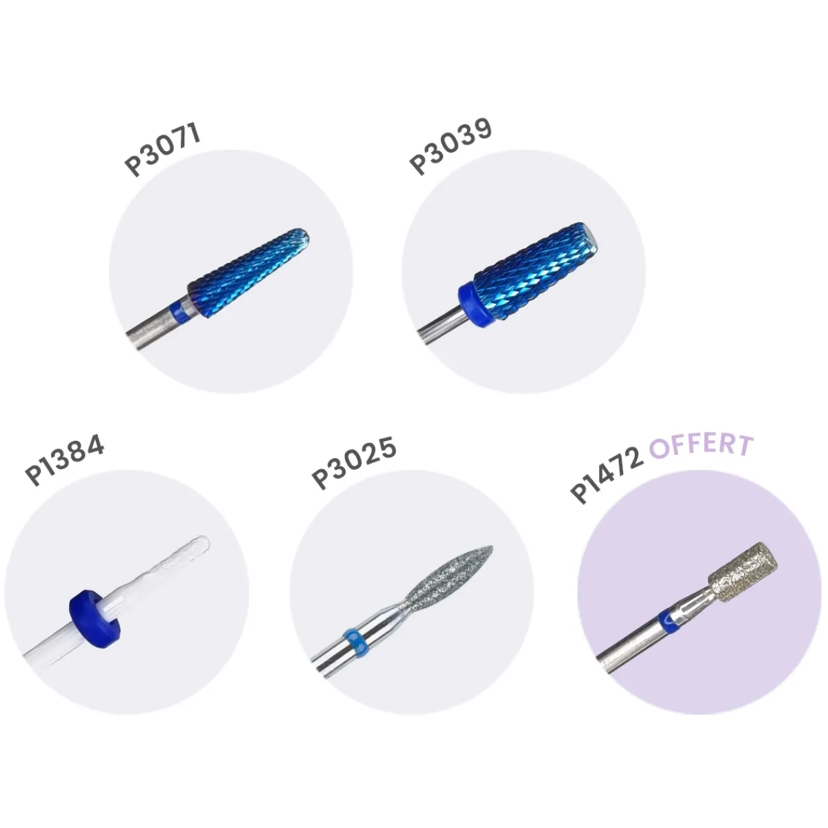 Le KIT DE FRAISES N°8 contient 5 embouts de la marque Purple Professional dont 1 embout offert. Dans ce set complet vous retrouvez 2 fraises pour la dépose et la mise en forme, ainsi que 3 fraises pour le travail des cuticules. Ce kit est bonne manière de découvrir et tester les embouts de ponceuse de la marque Purple Professional. Contenu du KIT :