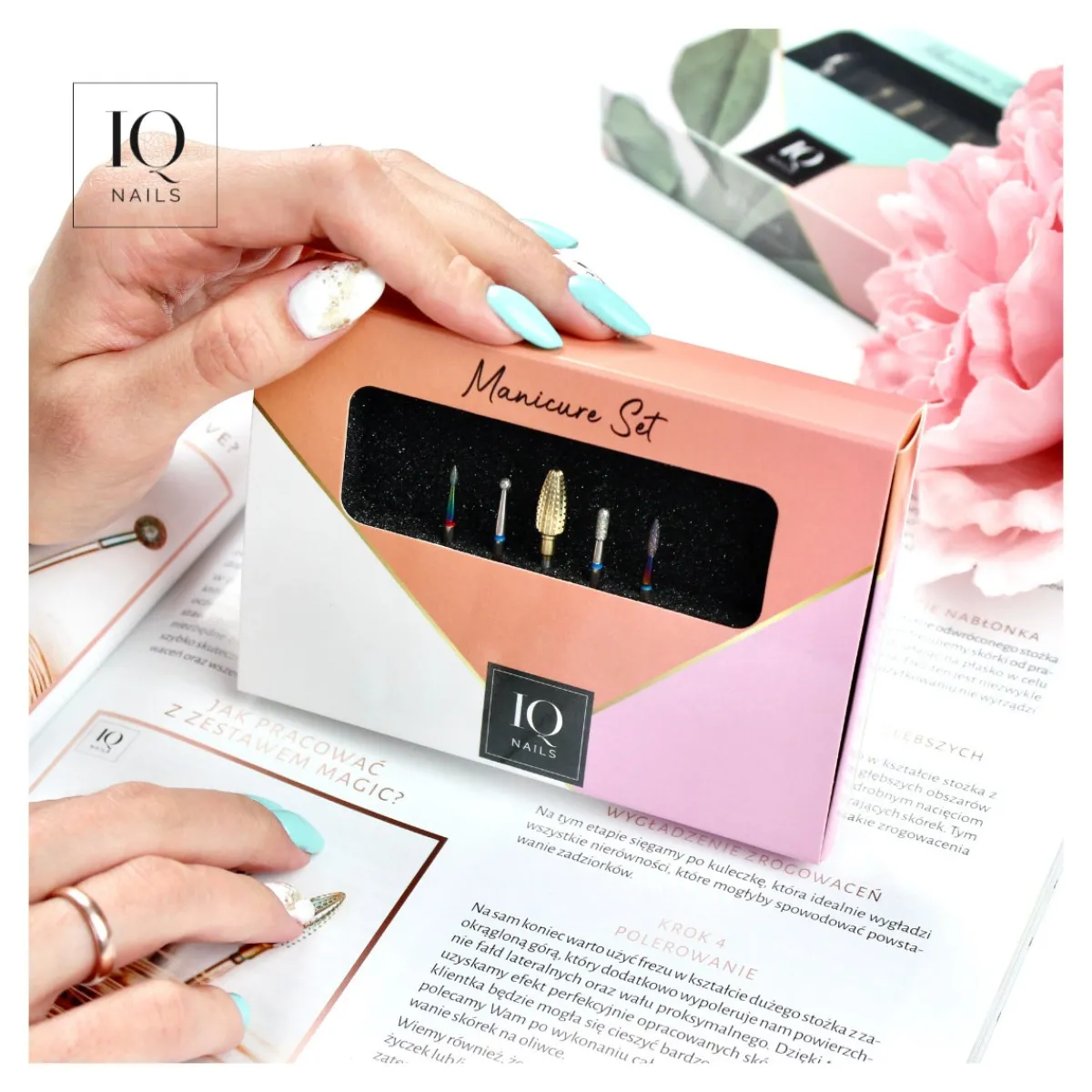 Set manucure « Expert II » comprenant 5 fraises de la marque IQ Nails : une fraise en carbure avec une couche de revêtement dorée NANO en zirconium pour la dépose du semi-permanent, du gel et de la résine, ainsi que quatre fraises en diamant pour les cuticules dont deux avec une couche de revêtement NANO caméléon. Ces embouts peuvent être stérilisés dans un autoclave. Ce kit est parfait pour les prothésistes ongulaires familières avec la technique de manucure sèche et qui veulent expérimenter des techniques de manucure plus avancées.