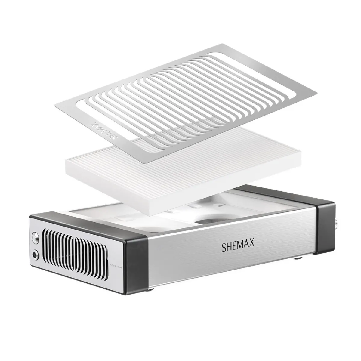 L’aspirateur de table Shemax est très performant avec ses deux moteurs centrifuges et sa puissance de 54W. Grâce à la technologie « air bowl » (effet tornado), le flux d’air capte la poussière sur tout le périmètre du modèle et la redirige vers le centre à une vitesse d’aspiration de 3,7 m/s . Le volume d’air filtré est de 600 m3 par heure ce qui vous assure une protection maximale contre la poussière à manucure durant le limage ou la dépose à la ponceuse. La durée de fonctionnement continu de chaque moteur peut aller jusqu’à 6 ans. L’aspirateur contient un filtre dans le carton et le câble d’alimentation est fourni. Pour entretenir votre filtre, il vous suffit de le retirer et de le nettoyer régulièrement. Nous proposons également des filtres de rechange s’il doit être remplacé sachant que la durée de vie d’un filtre est de 3 mois (pour 4-5 clients par jour en moyenne).