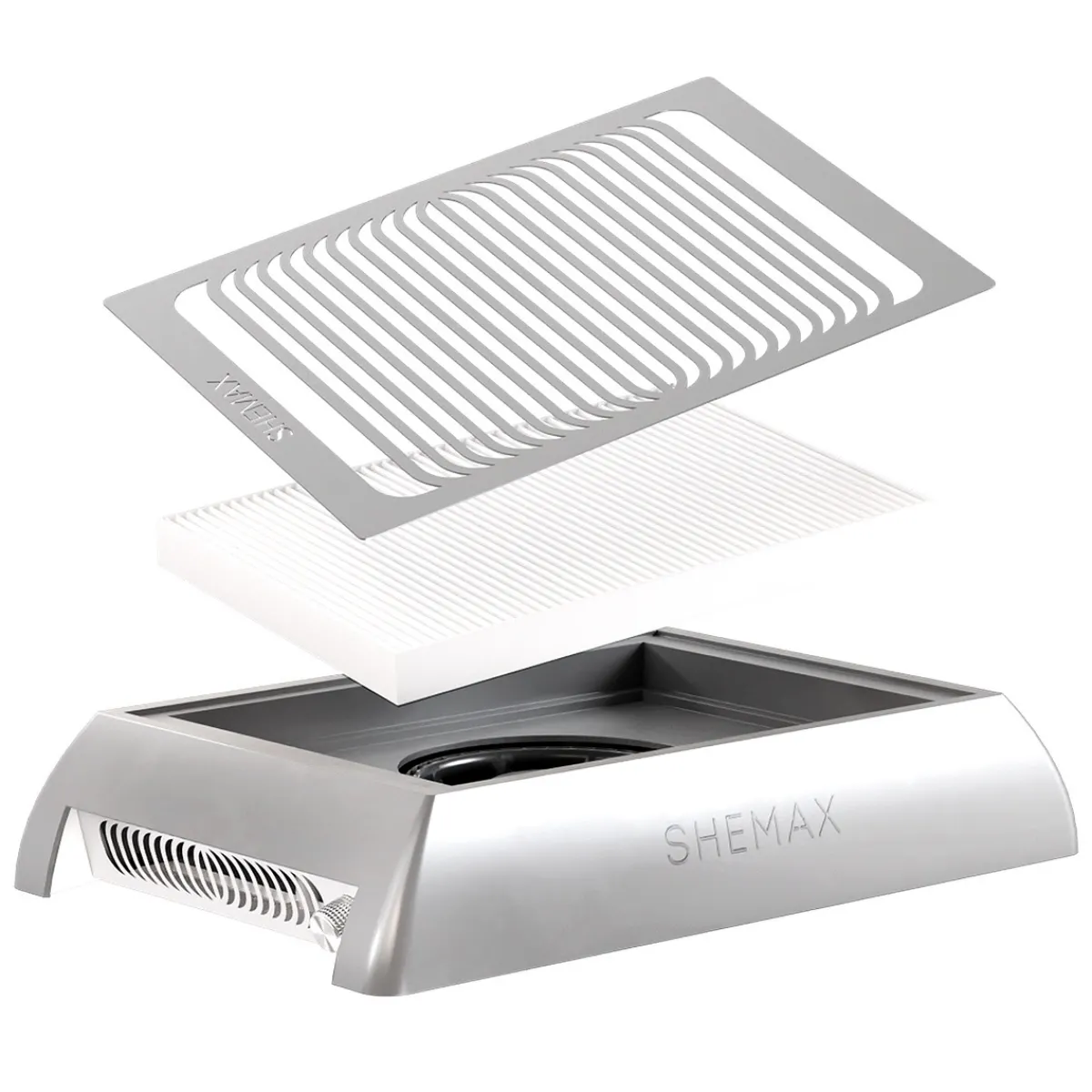 L’aspirateur de table Shemax est très performant avec sa puissance de 24W. Grâce au moteur centrifuge et à la technologie « air bowl », le flux d’air capte la poussière uniformément sur tout le périmètre du modèle et la redirige vers le centre comme une tornade à une vitesse d’aspiration de 2,2 à 3,7 m / s ce qui vous assure une protection maximale contre la poussière à manucure durant le limage ou la dépose à la ponceuse. Grâce à sa large zone d’aspiration d’une surface de 24,5 x 17,5 cm, la hotte empêche littéralement la poussière de monter dans les airs et de se déposer sur les objets. La durée de fonctionnement continu du moteur peut aller jusqu’à 6 ans. L’aspirateur contient un filtre dans le carton et le câble d’alimentation est fourni. Nous proposons également des filtres de rechange s’il doit être remplacé sachant que la durée de vie d’un filtre est de 3 mois (pour 4-5 clients par jour en moyenne).