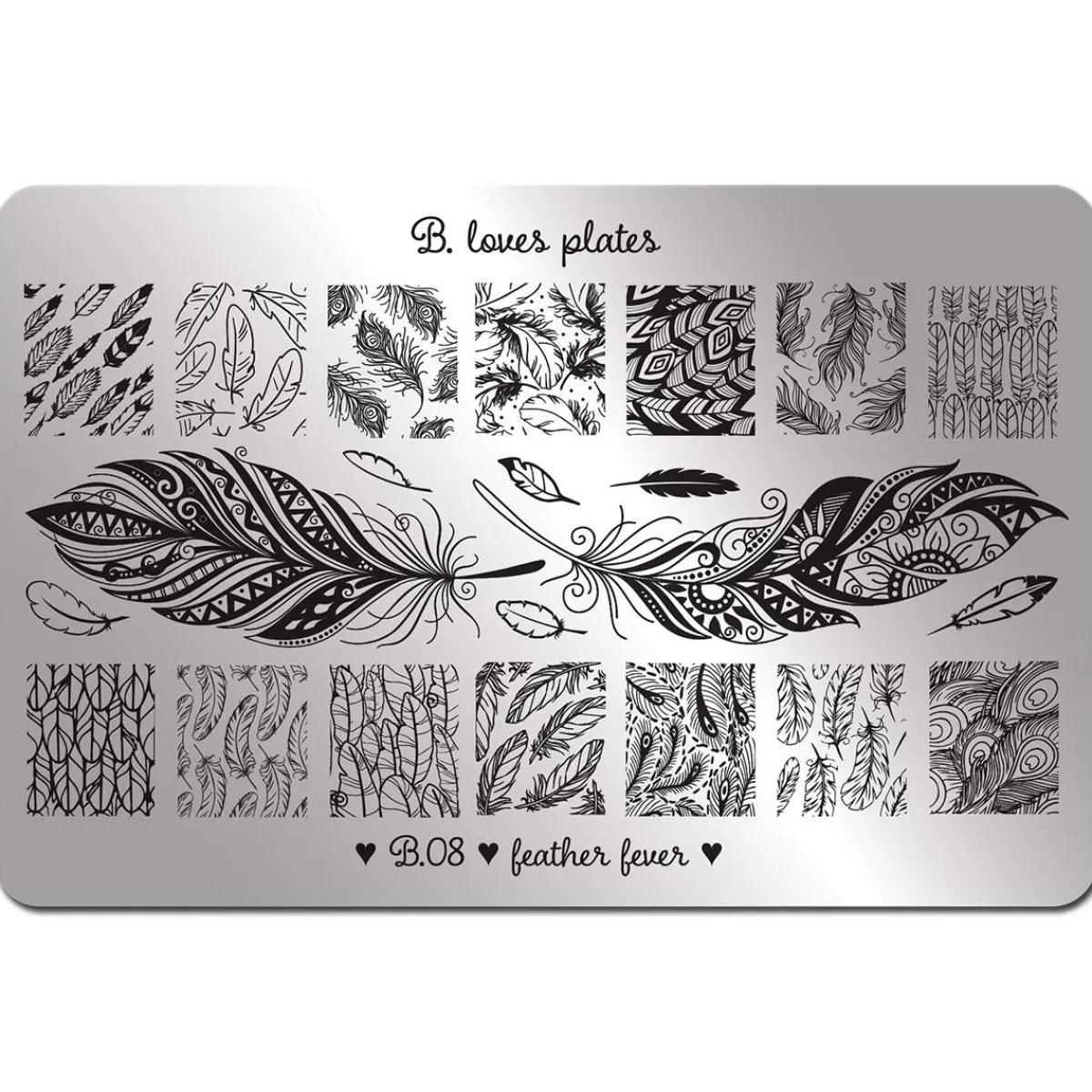 Plaque de stamping XL de la marque B. Loves Plates de 14,5 cm x 9 cm. Chaque plaque contient plusieurs motifs de différentes sortes illustrant un thème précis. La taille d’un motif est de 1,7 cm x 2,0 cm. Ces plaques de stamping se rangent dans l’organisateur B. Loves Plates. Les plaques de stamping XL B. Loves Plates sont au nombre de 13.