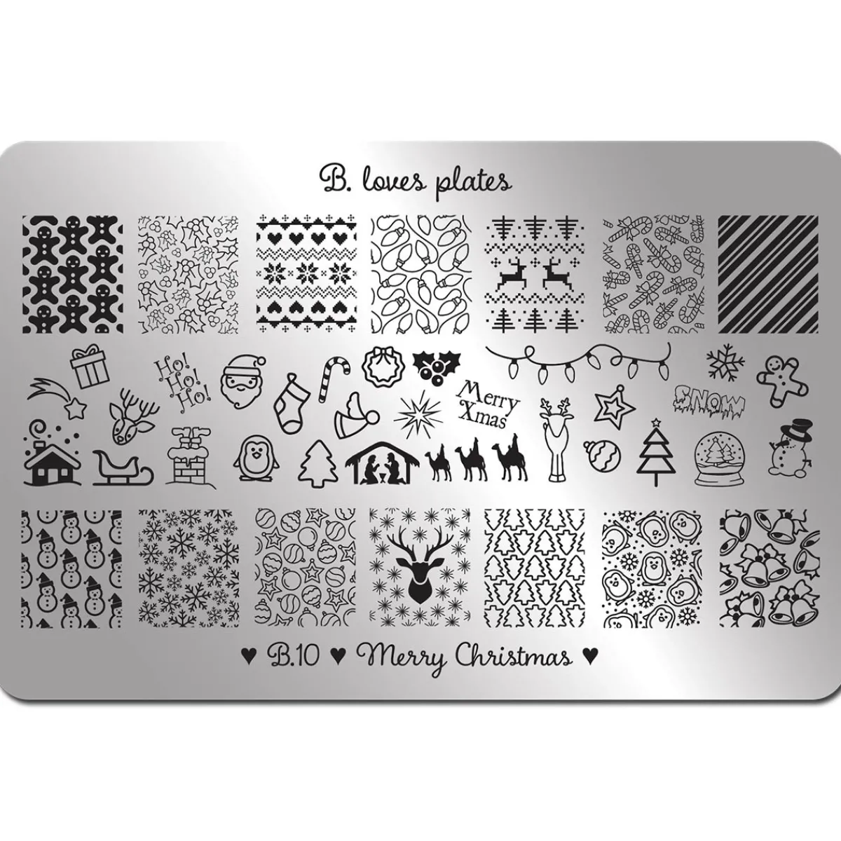 Plaque de stamping XL de la marque B. Loves Plates de 14,5 cm x 9 cm. Chaque plaque contient plusieurs motifs de différentes sortes illustrant un thème précis. La taille d’un motif est de 1,7 cm x 2,0 cm. Ces plaques de stamping se rangent dans l’organisateur B. Loves Plates. Les plaques de stamping XL B. Loves Plates sont au nombre de 13.