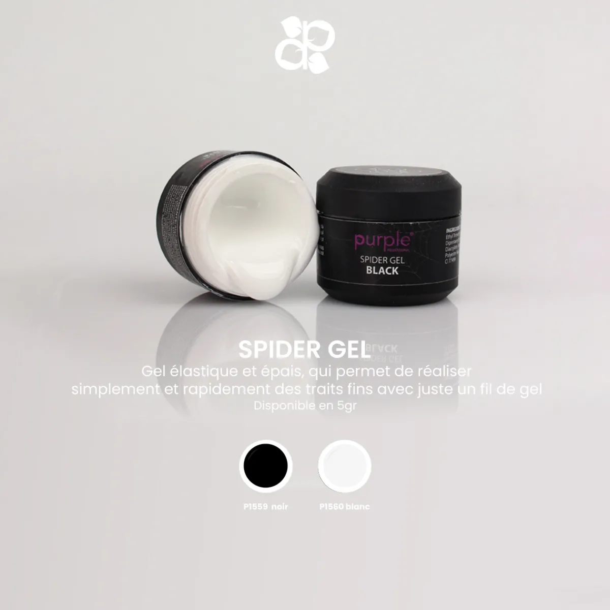Spider Gel Blanc de 5 gr pour Nail art. Le spider gel est un gel élastique et épais, qui permet de réaliser simplement et rapidement des traits fins avec juste un fil de gel. Application : le spider gel doit être appliqué après le gel de construction ou le vernis semi-permanent à l’aide d’un pinceau fin ou d’un dotting tool. Prélevez du gel dans le pot puis étirez le gel jusqu’à former un fil de gel, puis appliquez-le sur l’ongle. Se catalyse 60 secondes sous lampe LED et 120 secondes sous lampe UV.