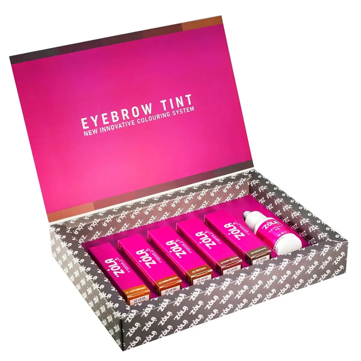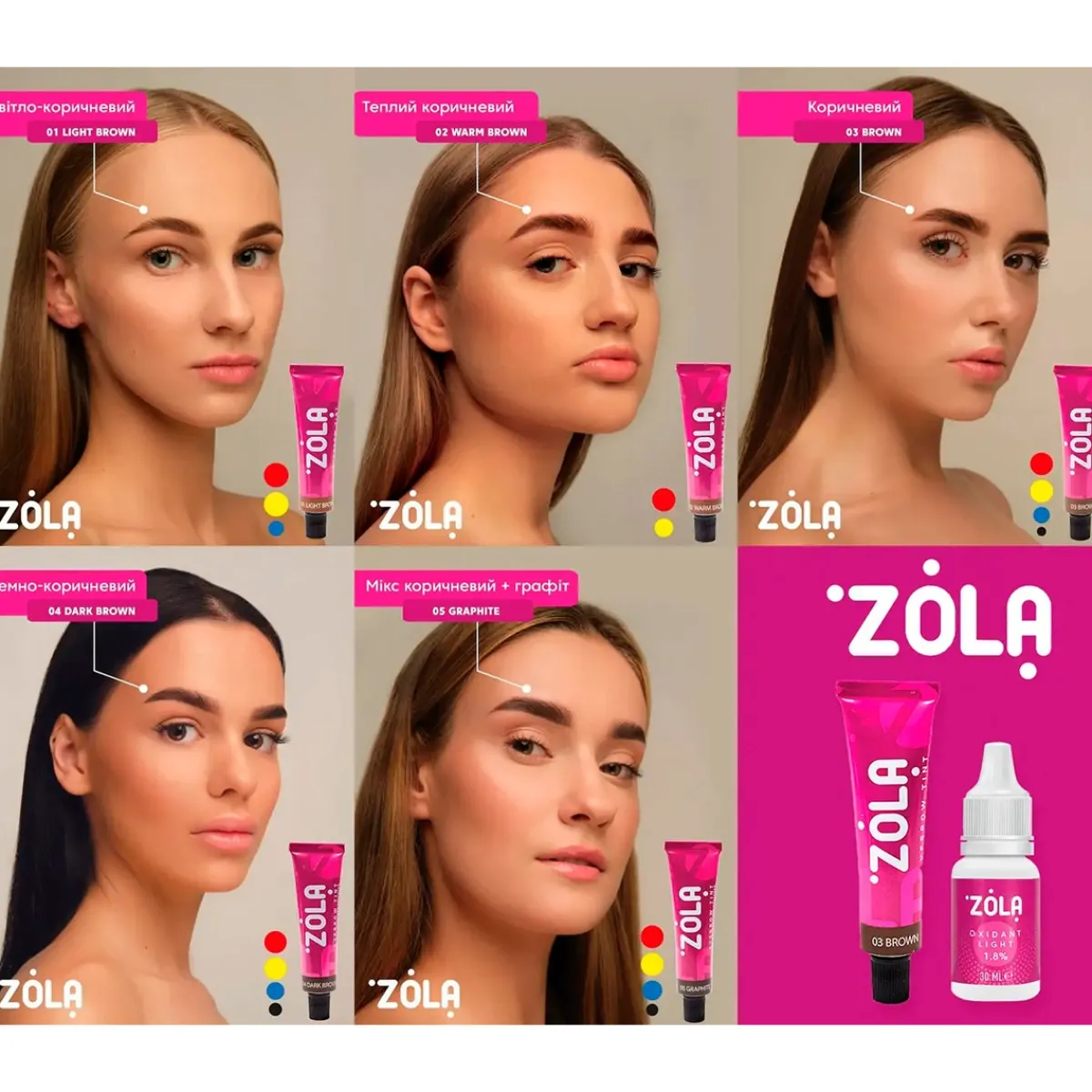 Ensemble de 5 teintures à sourcils au collagène et oxydant 3% de chez Zola. La teinture permanente ZOLA est une teinture révolutionnaire qui assure une coloration de haute qualité, tout en apportant du soin au sourcils grâce à ses ingrédients actifs bénéfiques. Le collagène renforce le poils des sourcils, leur conférant élasticité et brillance. La lanoline et le sorbitol hydratants pénètrent en profondeur dans la structure du poil, assurant une hydratation intense. La composition unique riche en pigment et la texture lamellaire permettent d’obtenir un résultat de haute qualité. Cette coloration concentrée pour sourcils donne une teinte unique grâce à l’ingrédient alcalin de nouvelle génération DMAMP ULTRA PC. Le colorant, après teinture, donne un tracé uniforme et net sur la peau longue tenue. La teinture présente une consistance crémeuse, facilitant son mélange et son application sur les sourcils. Les nuances peuvent être mélangées entre elles pour créer des couleurs uniques.