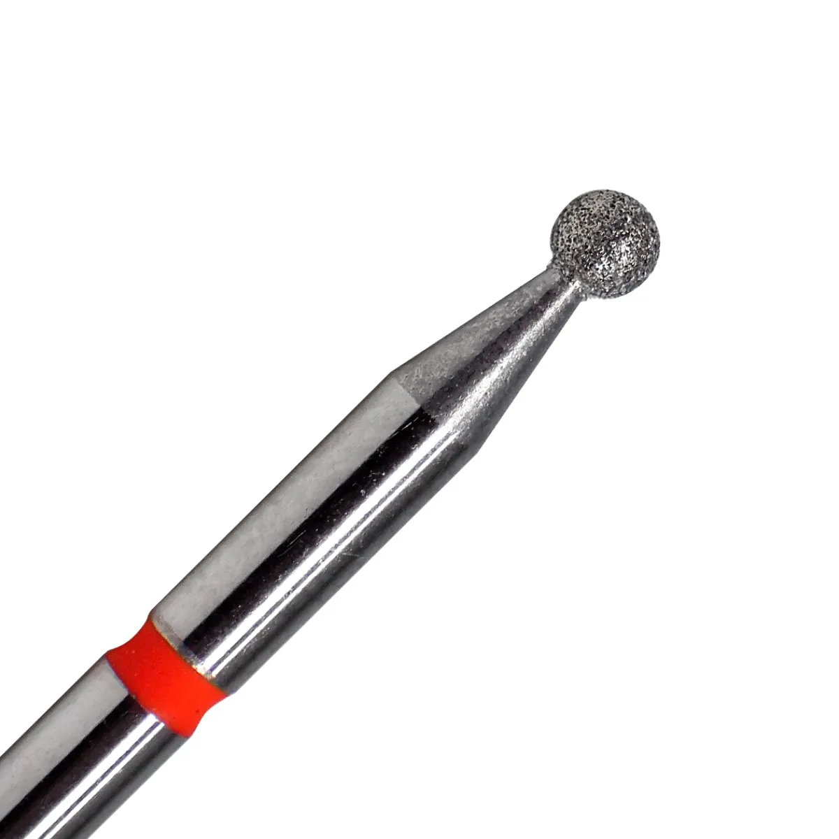 Fraise en diamant forme boule. Grain rouge (Doux). Diamètre : 0,21 cm. S’utilise pour la coupe des cuticules sans pince à envies en technique de manucure russe.