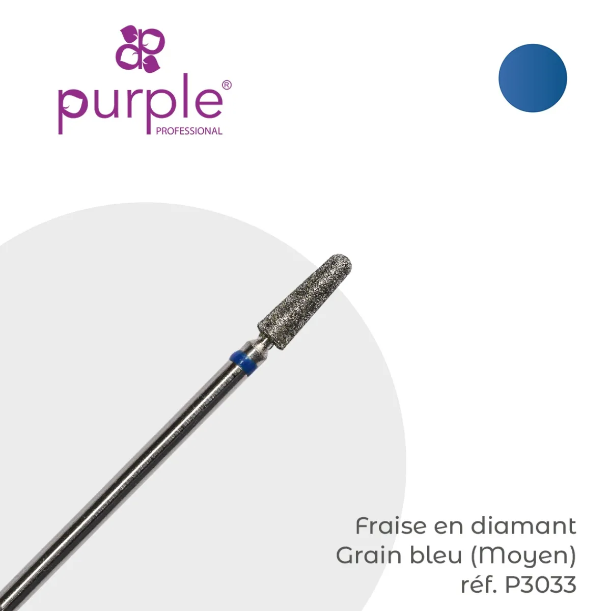 Fraise manucure Russe en diamant forme conique grain bleu (moyen). Marque Purple. Diamètre : 3,3 mm et longueur de la tête : 10 mm. S’utilise pour la préparation de la plaque de l’ongle, pour éliminer et nettoyer les cuticules ainsi que pour gommer les callosités sur le pourtour de l’ongle. Cette fraise permet d’optimiser l’adhésion du gel à l’ongle naturel et d’éviter les décollements.