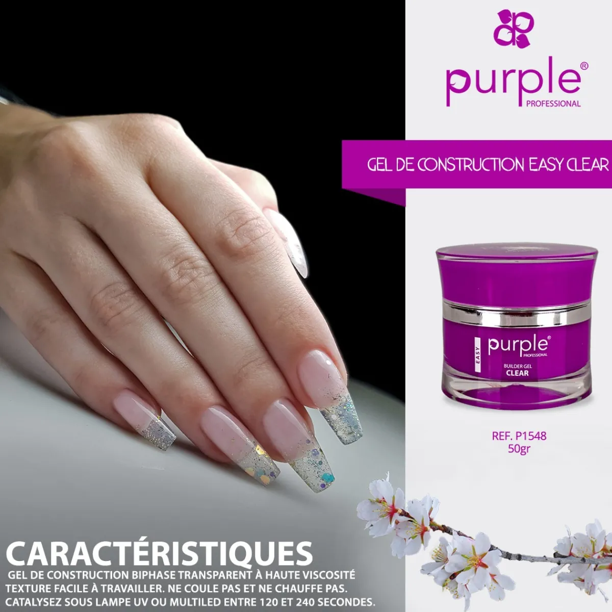 Le EASY CLEAR BUILDER GEL de Purple Professional est un gel de construction biphase transparent à haute viscosité. Ce gel est un produit 2 en 1 puisqu’il s’utilise en tant que base et également en tant que gel de construction. Il s’utilise pour la construction, le modelage, le remplissage et le gainage de l’ongle tant sur ongles naturels, que sur capsules. Il vous permet également de réaliser des extensions sur chablon. Sa texture est facile à travailler car elle ne coule pas et ne chauffe pas. Ce gel est idéal pour les débutants. Il est disponible en pot de 50 gr.