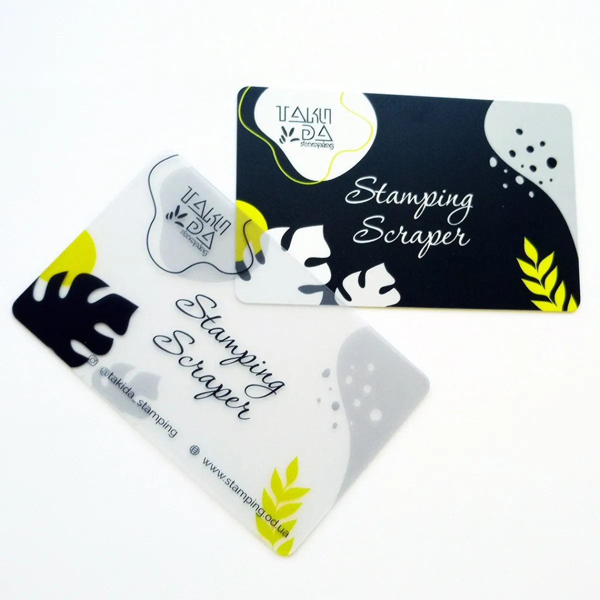 Jeu de 2 cartes à racler pour le stamping de la marque Taki Da de dureté différente : la carte noire est rigide et la carte transparente est plus souple. Cette dernière plus flexible sera utilisée pour les motifs avec des lignes fines. Ces cartes de différentes densités vous permettront de faire face à tous types de motifs et de racler le vernis en un seul geste, sans pression. Carte à l’impression UV résistante.