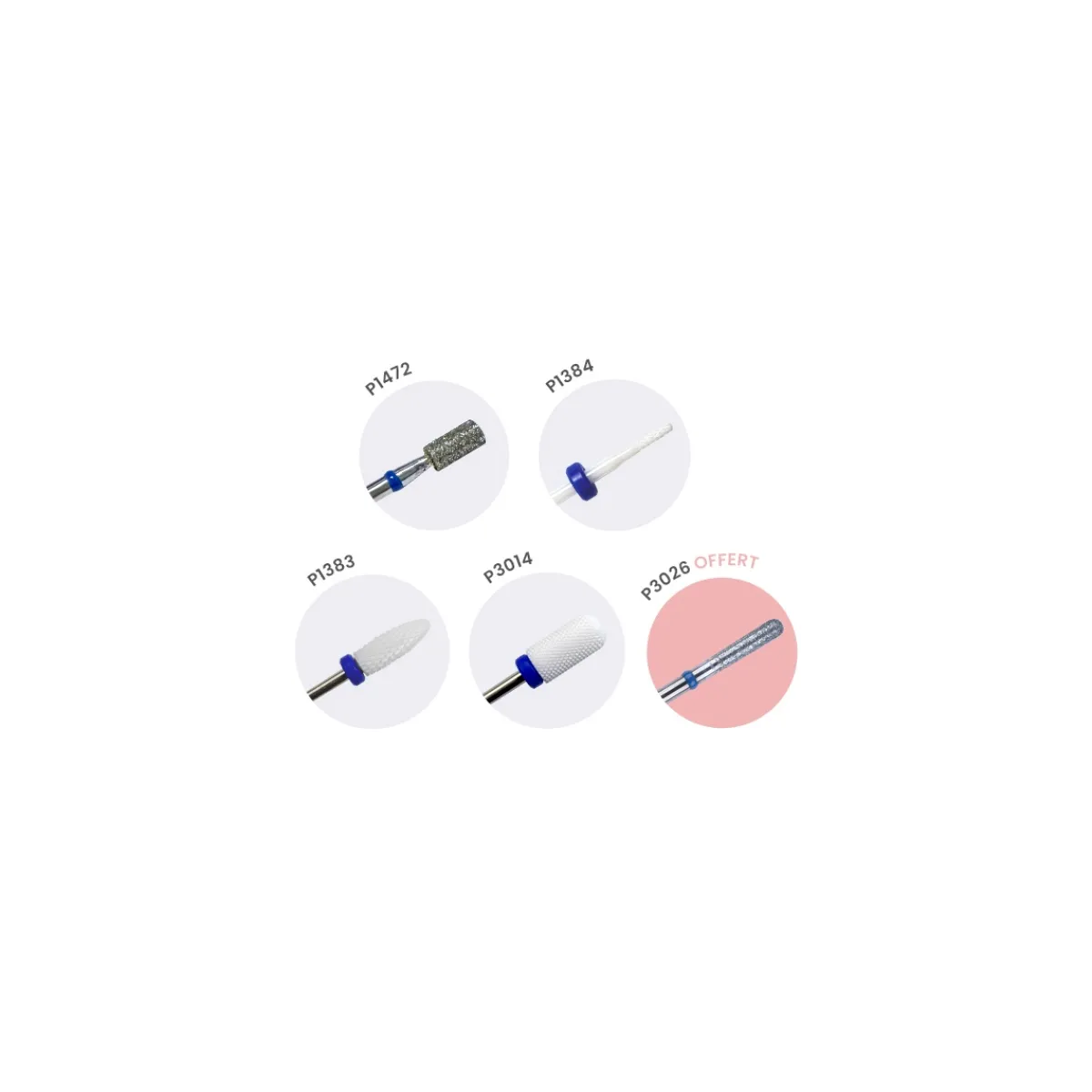 – OFFERT : P3026 Fraise tonneau en diamant : Fraise en céramique grain bleu (Moyen) forme tonneau. Idéale pour la dépose du gel, de la résine et de l’acrygel, ainsi que pour affiner la forme de la construction. Diamètre : 6,6 mm et longueur tête : 13 mm.