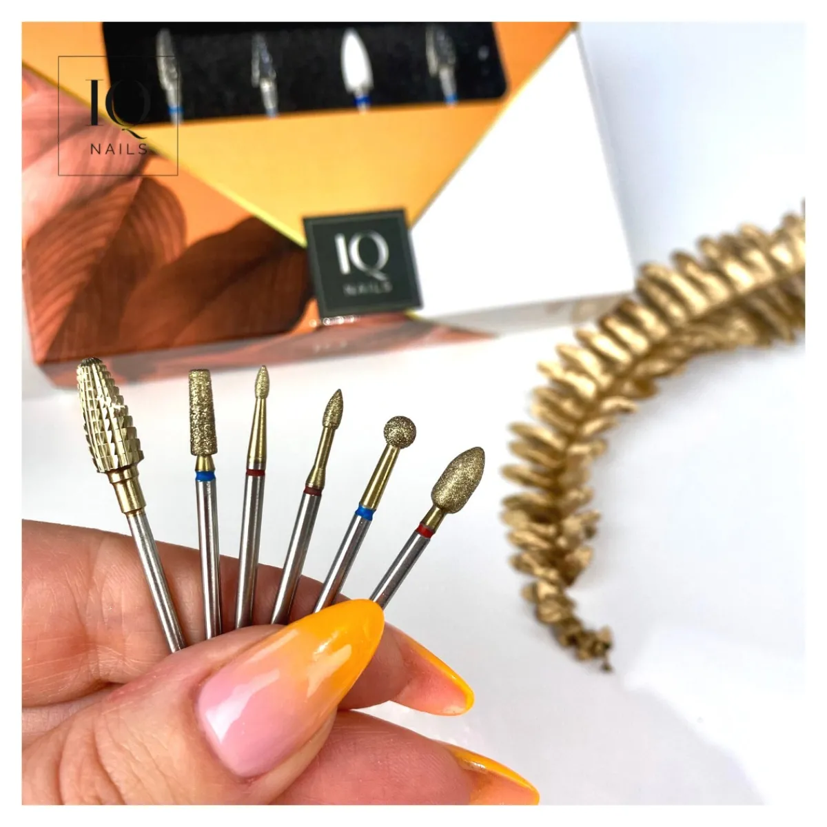 Set manucure « Expert Gold Power » comprenant 6 fraises de la marque IQ Nails : une fraise en carbure pour la dépose du semi-permanent et du gel, ainsi que la mise en forme de la construction en gel, acrygel ou résine tout en douceur; et cinq fraises en diamant pour les cuticules. Les 6 embouts sont recouverts d’une couche de revêtement NANO en zirconium dorée qui assure une meilleure biocompatibilité et est recommandée pour les personnes allergiques aux métaux. Ces embouts peuvent être stérilisés dans un autoclave. Ce kit a été crée pour les prothésistes ongulaire qui aiment travailler rapidement.
