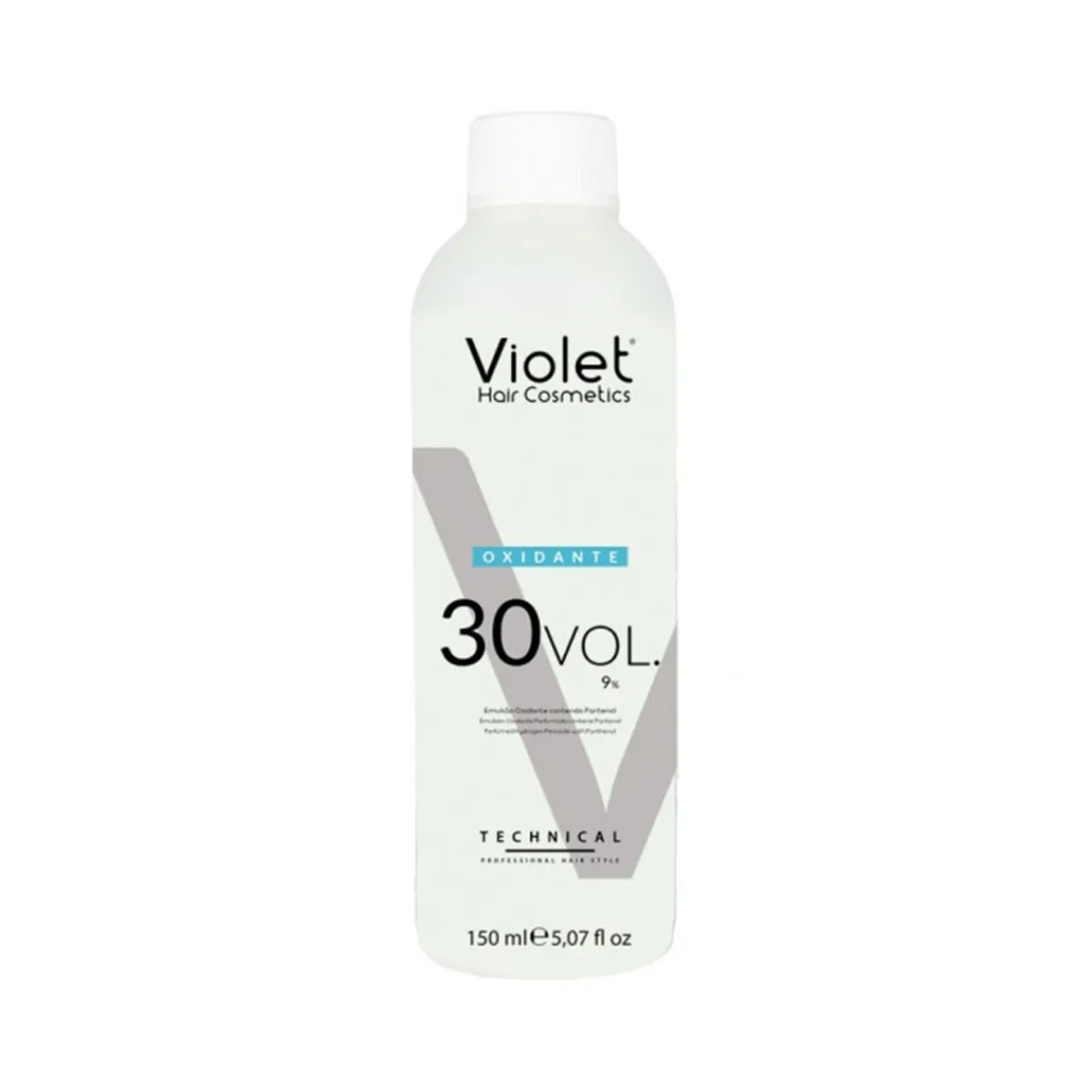 Oxydant 30 Volumes 9% de la marque Violet. Cette émulsion oxydante crémeuse et parfumée, contient du panthénol (Vitamine B5) pour prendre soin de vos cheveux. 150 ml.
