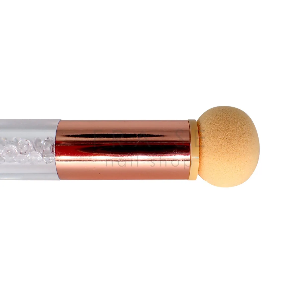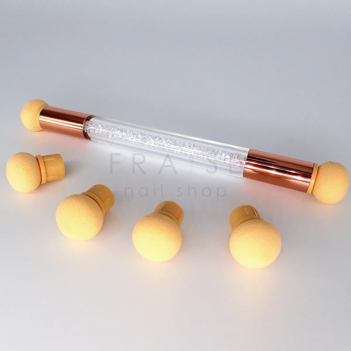 Ce stylo éponges double tête est un outil Nail art qui permet de réaliser la technique du Babyboomer et toutes sortes de dégradés. Il est composé d’un manche avec une éponge de chaque côté. Les embouts éponge sont amovibles et peuvent être retirés et changés au gré de vos envies. Le kit contient le manche et 4 embouts : deux embouts éponge arrondis, et deux embouts éponge pointus.